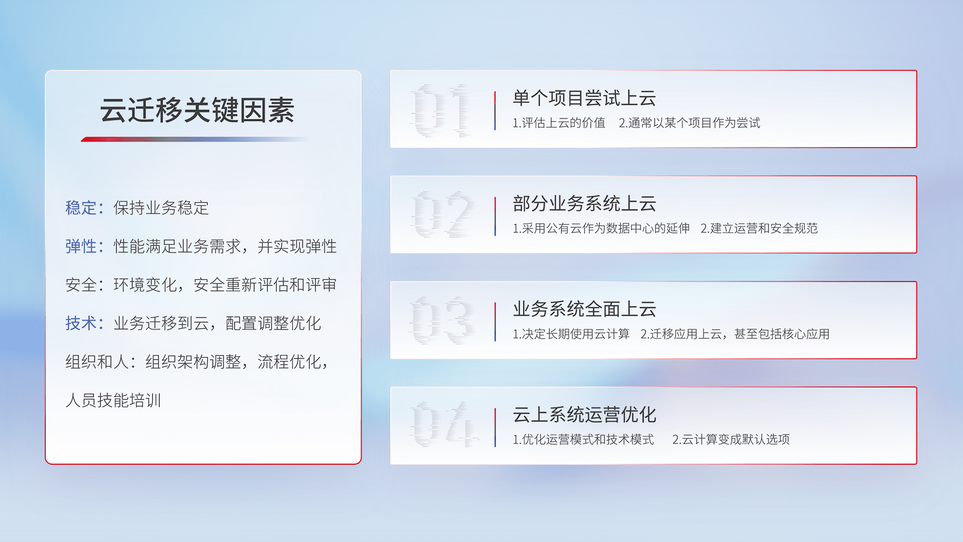 结合实际业务,,,,从规划设计、、、云平台选型、、、云原生改造、、、数据迁移、、集成交付,,,,迁移全过程为客户识别最佳上云路径,,,,做好风险识别管理,,,,设计网络架构、、、、身份权限、、、、安全审计合规、、、操作审计、、日志审计、、、、监控告警策略、、、多站点容灾设计等,,,对云上基础设施进行整体规划,,提升IT治理水平,,,以满足弹性、、、高可用、、、高性能的需求。。。